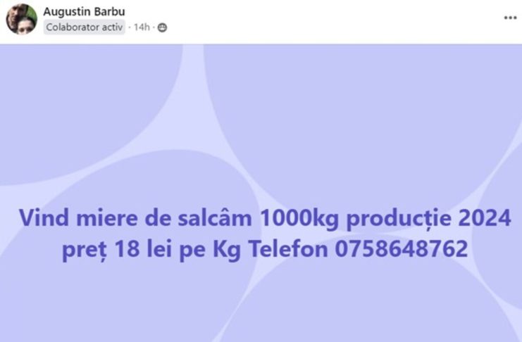 „Vând miere de salcâm, 1000 kg producție 2024, la prețul de 18 lei/kilogram”, suna anunțul postat pe grup de apicultorul Augustin Barbu.