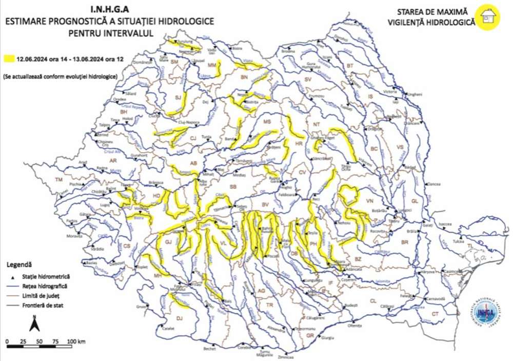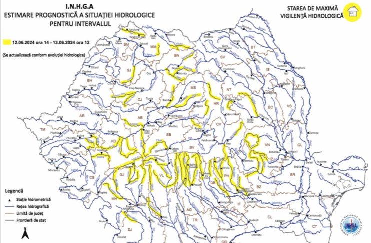 Potrivit prognozei INHGA, în intervalul 12.06.2024, ora 14:00 – 13.06.2024, ora 12:00, se pot produce scurgeri importante pe versanţi, torenţi şi pâraie, viituri rapide pe râurile mici cu posibile efecte de inundaţii locale şi creşteri de debite şi niveluri, cu posibile depăşiri ale Cotelor de atenţie, pe râurile din bazinele hidrografice: Vişeu – bazin superior şi afluenţi bazin mijlociu şi inferior, Iza – bazin superior şi afluenţi bazin mijlociu şi inferior, Lăpuş – bazin superior şi afluenţi bazin mijlociu şi inferior (judeţul Maramureş), Tur (judeţul Satu Mare), Someşul Mare – bazin superior şi afluenţi bazin mijlociu şi inferior (judeţul Bistriţa Năsăud), Someşul Mic – bazin superior şi afluenţi bazin mijlociu şi inferior (judeţele: Bihor şi Cluj), Someş – afluenţii mici aferenţi sectorului aval S.H. Dej (judeţele: Cluj, Sălaj, Maramureş şi Satu Mare), Mureş – bazin amonte S.H. Topliţa şi afluenţii aferenţi sectorului aval S.H. Topliţa – amonte S.H. Luduş (judeţele: Harghita, Mureş şi Bistriţa Năsăud), Târnava Mare – bazin superior şi afluenţi bazin mijlociu şi inferior (judeţele: Harghita, Mureş, Braşov, Sibiu şi Alba), Mureş – afluenţii aferenţi sectorului aval confluenţă cu râul Târnava – amonte S.H. Brănişca (judeţele: Alba, Sibiu şi Hunedoara), Bega – bazin amonte S.H. Făget şi afluenţii aferenţi sectorului aval S.H. Făget – amonte S.H. Remetea (judeţul Timiş), Timiş – afluenţii aferenţi sectorului aval S.H. Sadova – amonte S.H. Lugoj (judeţele: Caraş Severin şi Timiş), Desnăţui – bazin superior şi afluenţi bazin mijlociu şi inferior (judeţele: Mehedinţi şi Dolj), Jiu – bazin amonte S.H. Sadu şi afluenţii aferenţi sectorului aval S.H. Sadu – amonte confluenţă cu râul Gilort (judeţele: Hunedoara şi Gorj), Motru – bazin superior şi afluenţi bazin mijlociu şi inferior (judeţele: Gorj şi Mehedinţi), Gilort – bazin superior şi afluenţi bazin mijlociu şi inferior (judeţul Gorj), Râul Negru – bazin superior şi afluenţi bazin mijlociu şi inferior (judeţele: Harghita, Covasna şi Braşov), Olt – afluenţii aferenţi sectorului aval S.H. Sebeş Olt – amonte Ac. Ioneşti (judeţele: Sibiu, Vâlcea şi Argeş), Olteţ – bazin superior şi afluenţi bazin mijlociu şi inferior (judeţele: Gorj, Vâlcea, Dolj şi Olt), Argeş – bazin superior, Dâmboviţa – bazin superior (judeţele: Argeş şi Dâmboviţa), Ialomiţa – bazin amonte S.H. Pucioasa şi afluenţii aferenţi sectorului aval S.H. Pucioasa – amonte S.H. Siliştea Snagovului (judeţele: Dâmbovita, Prahova şi Ilfov), Prahova – bazin superior şi afluenţi bazin mijlociu şi inferior (judeţele: Prahova şi Ialomiţa), Buzău – afluenţii aferenţi sectorului aval S.H. Nehoiu – amonte S.H. Baniţa (judeţele: Buzău şi Prahova), Rm. Sărat – bazin superior şi afluenţi bazin mijlociu şi inferior (judeţele: Buzău şi Vrancea), Putna – bazin superior şi afluenţi bazin mijlociu şi inferior (judeţul Vrancea), Trotuş – bazin amonte S.H. Ghimeş Făget şi afluenţii aferenţi sectorului aval S.H. Ghimeş Făget – amonte S.H. Vrânceni (judeţele: Harghita, Bacău, Neamţ şi Covasna).