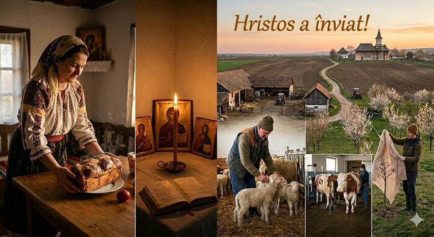 De Paște, România miroase a cozonac și a lumânări. Dar în mii de ferme din toată țara, sărbătoarea înseamnă cu totul altceva: miei de îngrijit, vaci de muls, pomi de salvat de îngheț și câmpuri care nu pot aștepta.