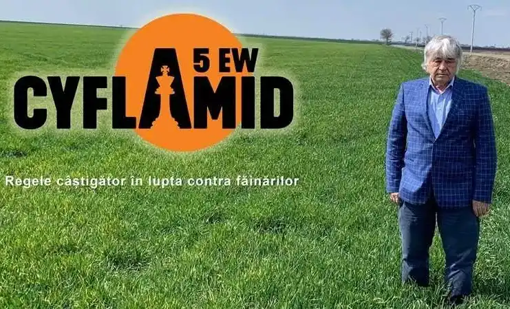 Doi regi la aceeași masă - discuție cu Domnul Dr.ing. Dimitrie MUSCĂ - Directorul CAI CURTICI și CAI OLARI Advertorial Dimitrie MUSCĂSummit Agro România propune pentru combaterea acestui patogen produsul Cyflamid 5 EW, având substanța activă ciflufenamid 5%, condiționat sub formă de emulsie de ulei în apă – formulare excepțională în practică datorită unei foarte bune aderențe pe suprafața tratată, fiind foarte greu spălat de ploi. Este omologat la cultura de grâu – 0,2L/ha, viță-de-vie – 0,3L/ha și măr – 0,45L/ha.