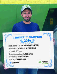 Următorul fermier campion este domnul Vocheci Alexandru, din Crângeni, județul Teleorman. Acesta lucrează 150 ha, rapiță a avut pe 30 ha, iar hibridul PT314 i-a oferit o producție de 4.200 kg/ha. “Am semănat rapița după grâu, așa că prima intervenție a avut loc cu grouperul, după care au avut loc două treceri cu grapa cu discuri, am fertilizat cu îngrășământ complex 18.46.0 și am semănat în data de 7 septembrie. În toamnă au fost aplicate 4 insecticide, iar la una dintre treceri am administrat și erbicid. În primăvară au mai fost aplicate 4 insecticide, la două dintre treceri am administrat și fungicide. Prima trecere cu insecticid a avut loc în luna martie, la avertizare pentru combaterea Ceutorhynchusului, apoi, înainte de apariția butonului floral, am administrat insecticid și fungicid, a urmat un nou insecticid, iar după înflorit, nu am avut apă să dăm chiar la înflorit, am administrat fungicid și insecticid sistemic și de contact. În ceea ce privește fertilizarea, am administrat 180 kg/ha de uree, la începutul lunii martie, și 180 kg/ha de nitrocalcar la începutul lunii aprilie. Recoltatul a avut loc în jurul datei de 25 iunie. Pot spune că a fost un hibrid bun, l-am ales și pentru această campanie, alături de PT315 pentru o suprafață de 30 ha, adică toată suprafața pe care o voi semăna cu rapiță“, a declarat fermierul campion.