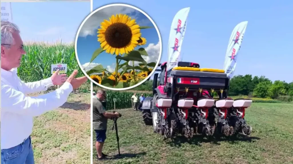„Astăzi, în premieră, înființăm o cultură de floarea-soarelui. Chiar dacă toți fermierii spun că este foarte târziu, suntem la sfârșit de lună iulie, să zicem deja început de august, astăzi, aplicând o tehnologie fără arătură (sau, cum i se mai spune, no-till – n. red.) – vedeți că punem sămânța direct în sol –, însă cu fertilizant de ultimă generație, avem un complex foarte interesant format din Azosulf GeMix Tehnology și Ideea Fertil. Ideea Fertil se așază direct în capul seminței, se plasează acolo, iar Azosulful lângă sămânță. Sigur, mai avem în semănătoare și granule de de poliacrilați pentru a depozita apa la rădăcina plantei”, a explicat fondatorul Romchim Protect, Ion Neculcea.