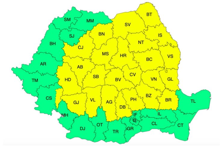 Administrația Națională de meteorologie a emis marți o avertizare Cod galben de instabilitate atmosferică temporar accentuată și cantități însemnate de apă, valabilă în 25 de județe (vezi harta).
