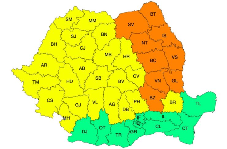 Potrivit acesteia, în județele Buzău, Vrancea, Galați, Vaslui, Bacău, Neamț, Iași, Botoșani și Suceava vor fi perioade cu ploi torențiale, iar în intervale scurte de timp sau prin acumulare cantitățile de apă vor fi de 40-60 l/mp și, izolat, de peste 70-80 l/mp.
