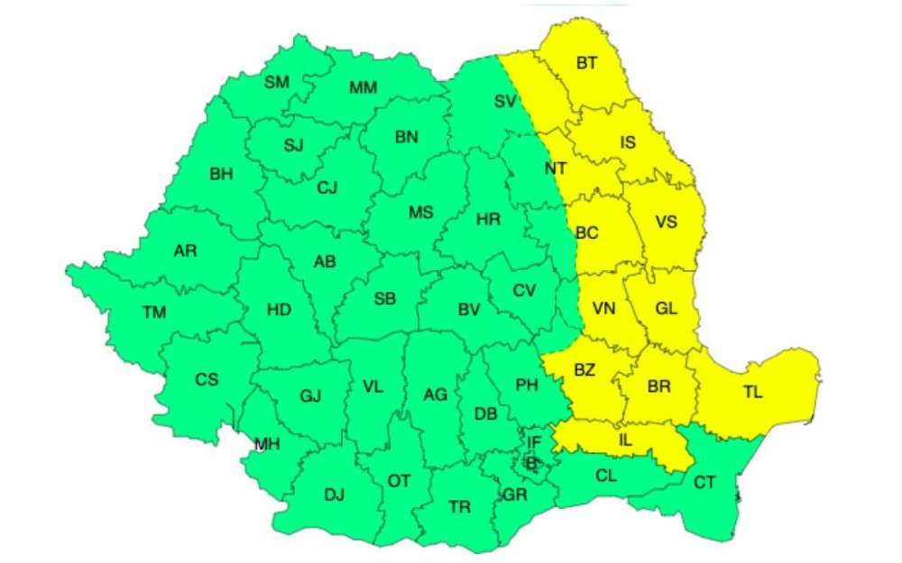 Tot vineri, ANM a emis și o avertizare meteo Cod galben de ninsoare viscolită, valabilă în intervalul 15 februarie, ora 5:00 – 15 februarie, ora 18:00, în 12 județe ale țării (vezi harta).