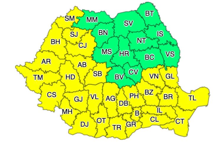 Într-un prim mesaj, Administrația Națională de Meteorologie a emis o avertizare Cod galben potrivit căreia duminică, 16 iulie, valul de căldură se va intensifica și va fi caniculă în vest, sud, sud-est și local în centru (vezi Harta 1). Disconfortul termic va fi ridicat, iar indicele temperatură-umezeală (ITU) va depăși pragul critic de 80 de unități. Temperaturile maxime se vor situa în general între 33°C și 37°C, iar minimele se vor încadra între 17°C și 25°C.