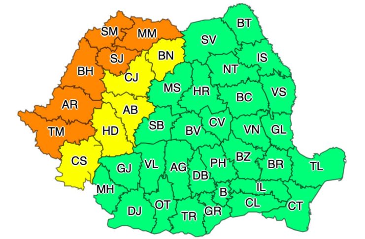 Potrivit meteorologilor, în intervalul 23 iunie, ora 19:00 – 24 iunie, ora 10:00, este valabilă o avertizare Cod galben de instabilitate atmosferică temporar accentuată ce vizează mai multe județe (vezi harta). Astfel, în vestul, nord-vestul și local în centrul țării, vor fi averse, descărcări electrice, intensificări de scurtă durată ale vântului, cu rafale de 55-75 km/h, și, pe arii restrânse, vijelii și grindină. În intervale scurte de timp sau prin acumulare, cantitățile de apă vor fi de 20-25 l/mp și izolat de peste 30-40 l/mp.