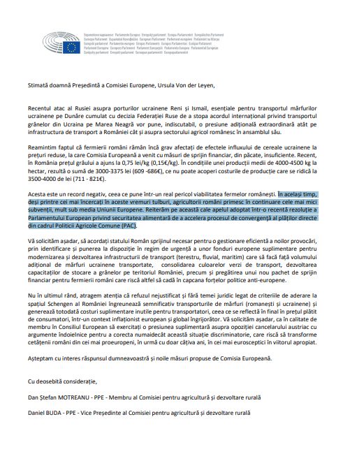 Cei doi europarlamentari atrag atenția că fermierii români sunt grav afectați de efectele influxului de cereale ucrainene la prețuri reduse, iar sprijinul financiar al Comisiei Europene pentru contracararea situației este, din păcate, insuficient, astfel că fermierii români au ajuns să lucreze în pierdere. Mai mult agricultorii români primesc în continuare cele mai mici subvenții, mult sub media Uniunii Europene.