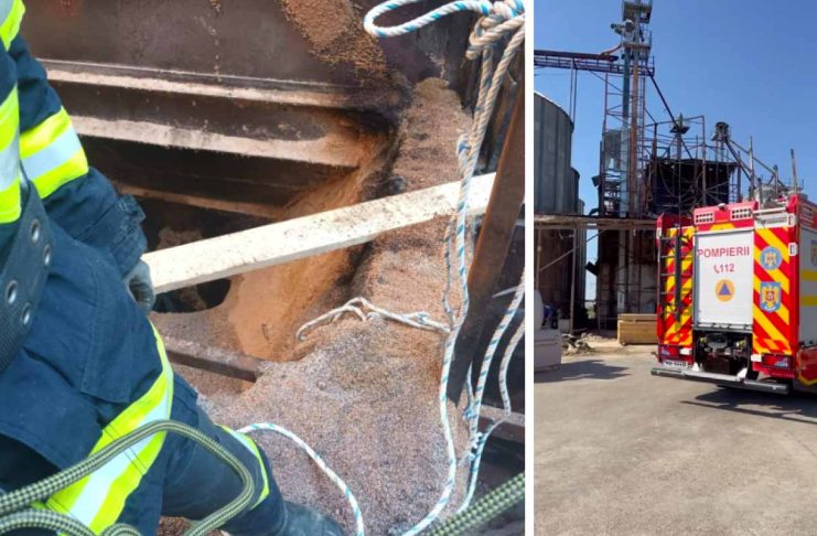 La fața locului au fost găsite două persoane căzute într-un siloz, una dintre acestea fiind blocată în sistemul de evacuare a cerealelor.
